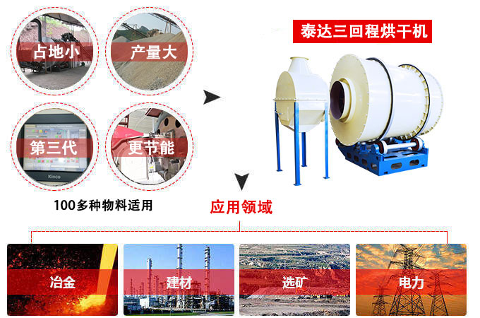 泰達S62系列三套筒迷你型干燥機是專門針對研制的迷你烘干機,產量分別為3t,5t,8t,10t/h。它的優點是抗過載能力強,迷你機身,烘干產量大,節能降耗。合理設計的三套筒保證在較短的行程將將物料烘干,比普通烘干機要節能占地空間。而且該機水平推力小,減少了擋輪托輪的磨損。
